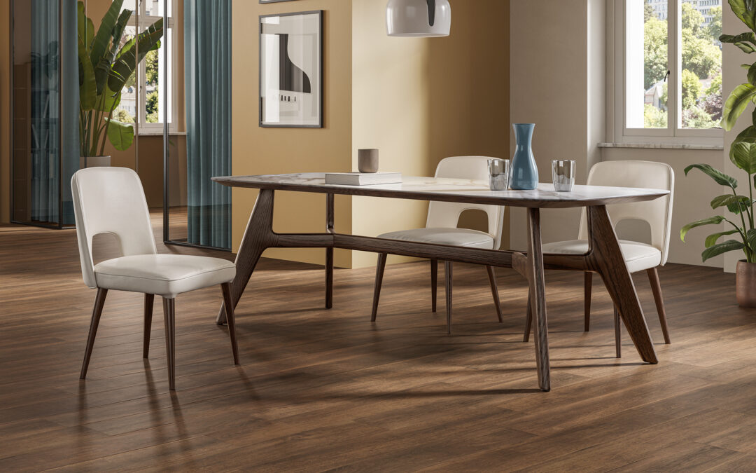Miza Plettro je na voljo v dveh dimenzijah: 90×160 cm V 75 cm in 90×180 cm V 75 cm, s fiksno ali raztegljivo površino.