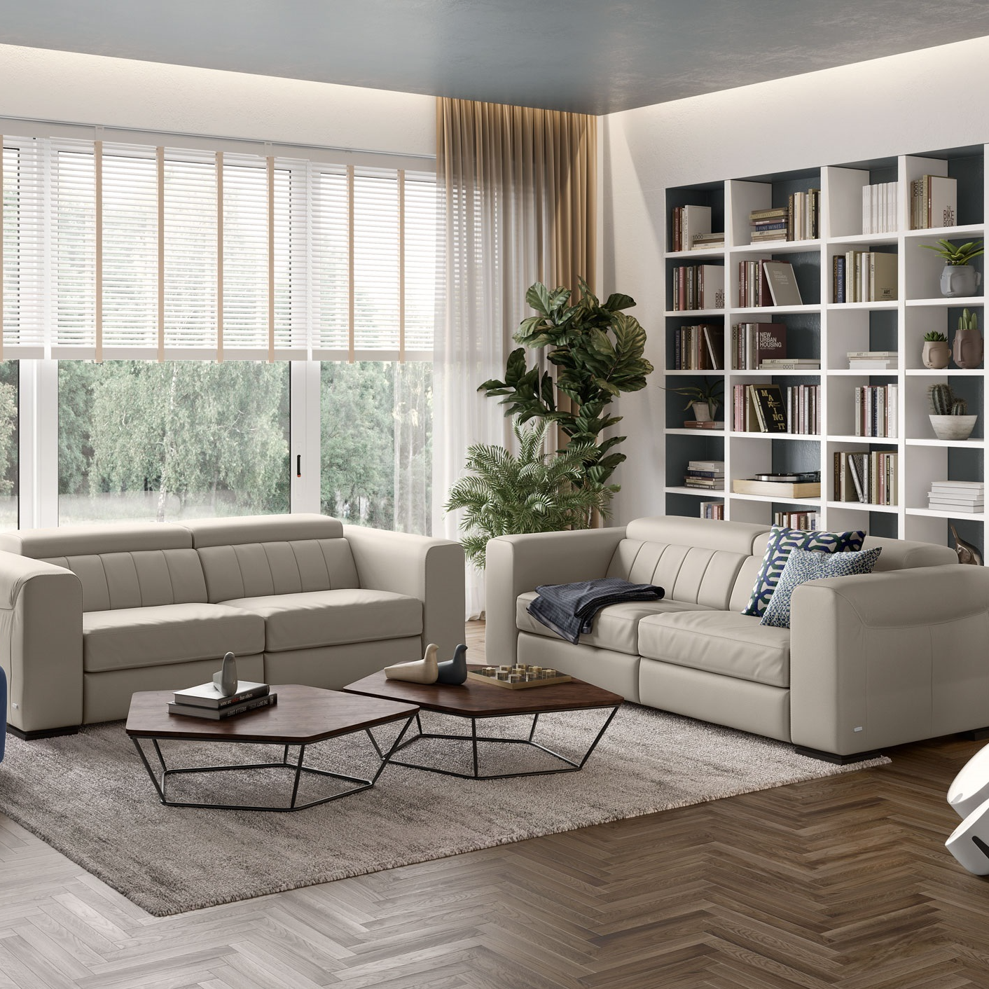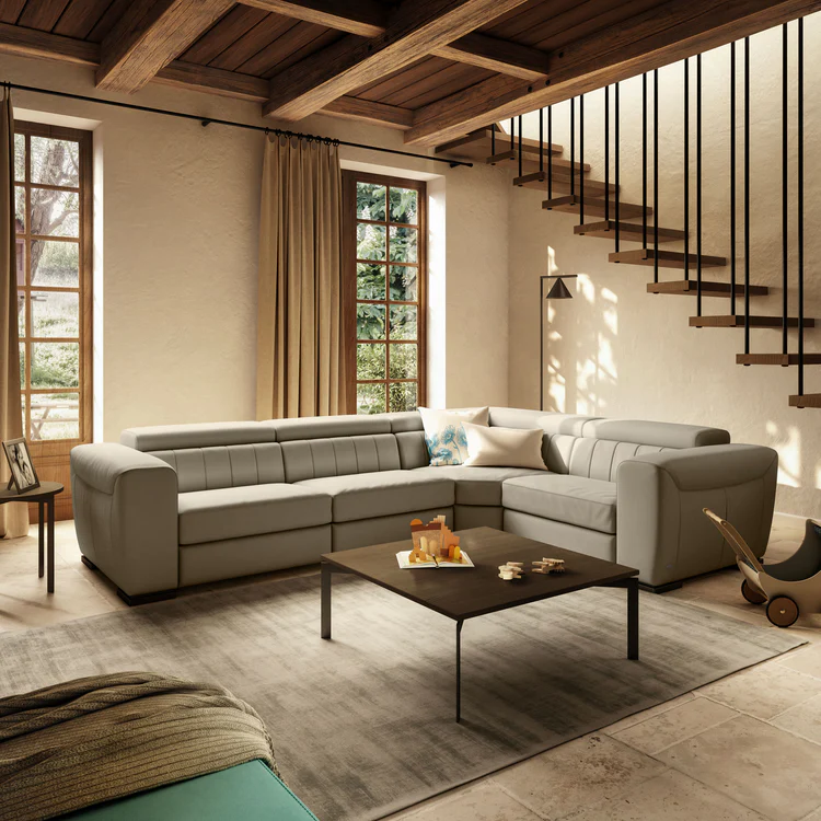 Globoki sedeži, kompaktni rokonasloni in električni mehanizmi Soft Touch sistema, vas bodo popeljali v svet udobja. Z rahlim dotikom na upravljalne gumbe električnega mehanizma, aktivirate funkcijo nagiba hrbtnega dela, hkrati pa odprete naslon za noge. Vzglavnike je mogoče nastaviti ločeno na vsakem sedežu za individualno udobje. Tako se lahko sprostite, ne da bi vam bilo treba vstati s kavča.