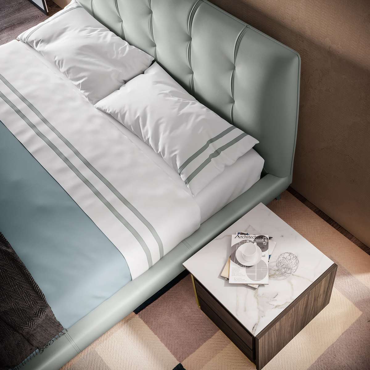 Eleganca in ekskluzivnost sta zaščitni značilnosti postelje Galattico. Njena navidezna preprostost odraža njene prednosti – linearno obliko, izvrstne materiale in skrbno ročno izdelavo. Galattico je navdihnjena z nebesnimi telesi Galaksije, kot so zvezde, vidne v šivih, ki držijo gube vzglavja na mestu.
