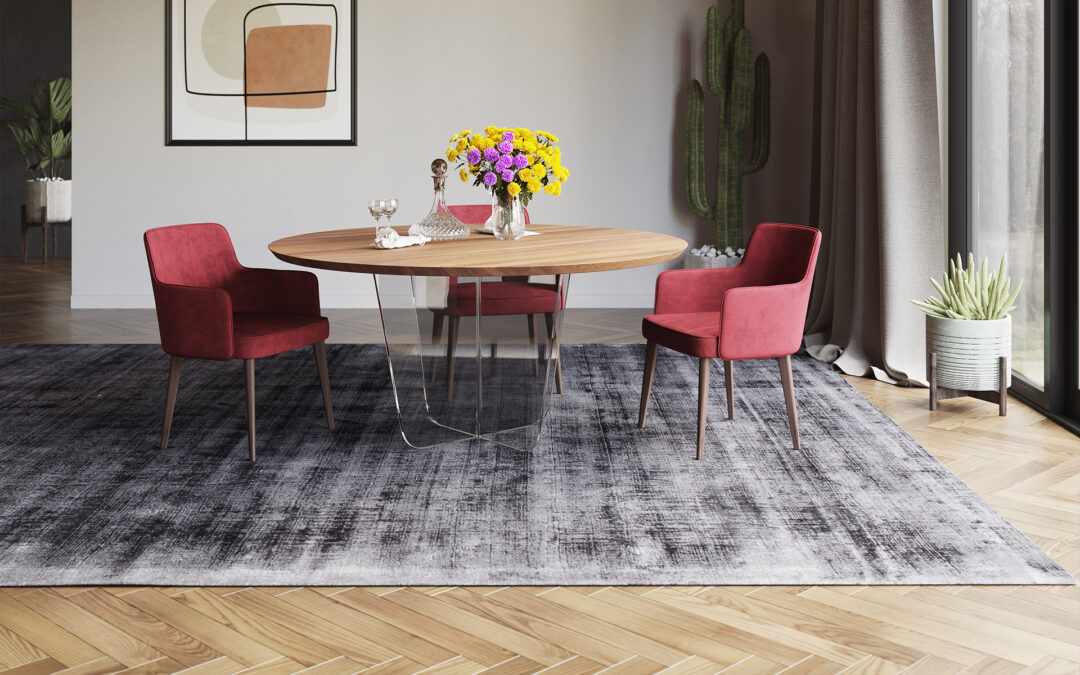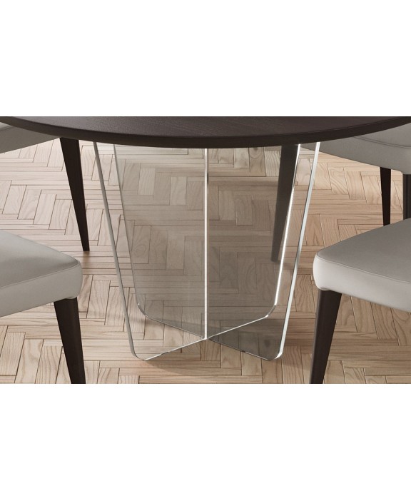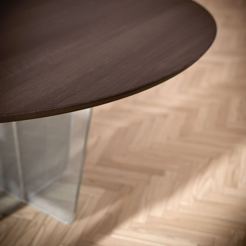 Miza Gira ima zračne in harmonične linije, ki odlično povezujejo les in steklo. Impozantna okrogla miza s prozornim steklenim podnožjem vizualno in funkcionalno obogati prostor.