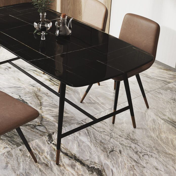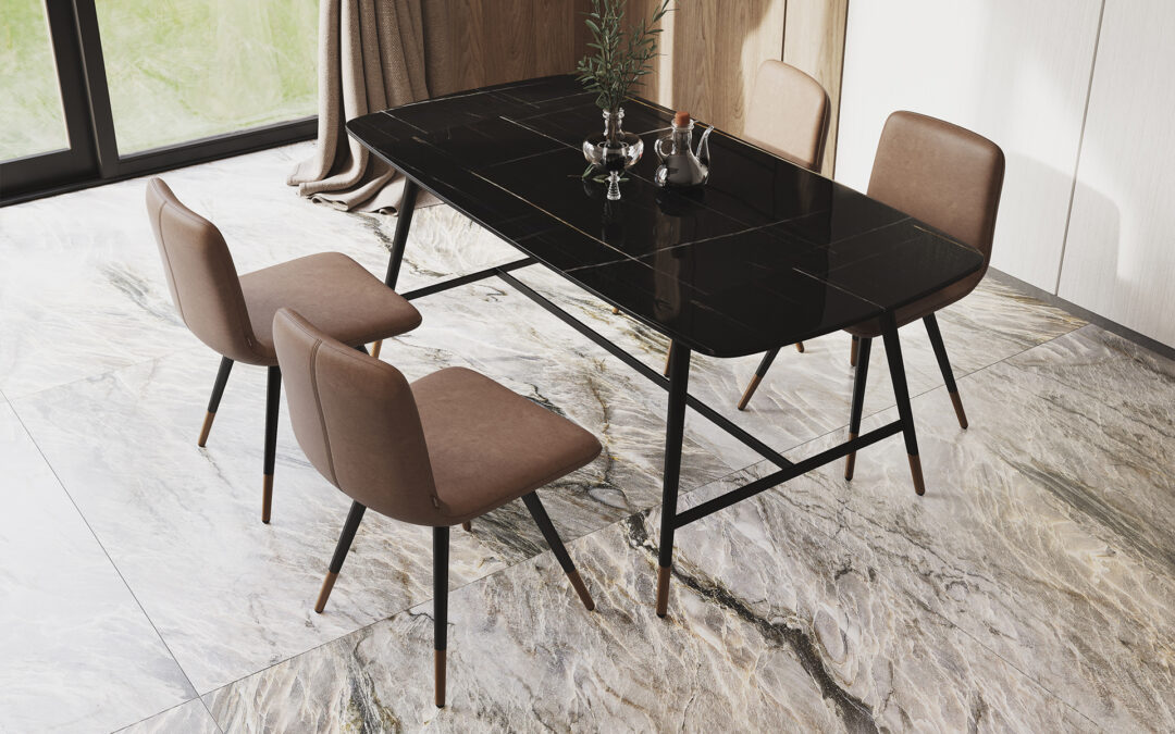 Miza Slancio je kombinacija keramike in kovine. Črna keramična plošča je prepredena z zlatimi žilami, noge pa so izdelane iz črno barvane kovine z veznim elementom, pobarvanim v bronu.