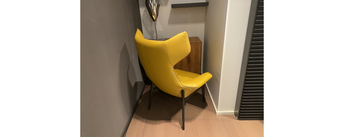 ODPRODAJA SE: fotelj model Aura. Fotelj je oblazinjen v rumeno Natural usnje.