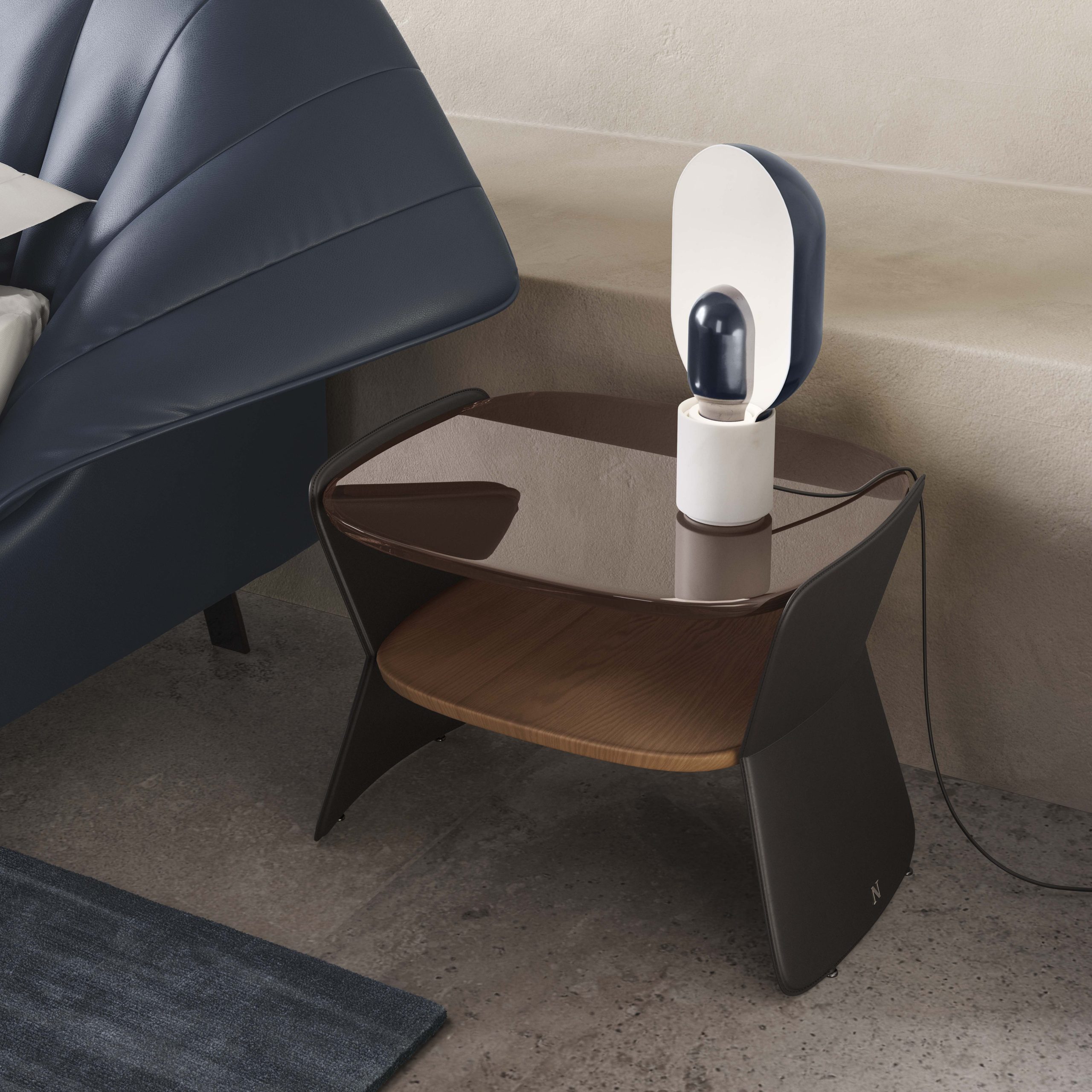 Popoln in vsestranski sistem nočnega shranjevanja, idealen za ustvarjanje harmoničnega spalnega prostora. Bogastvo uporabljenih materialov ter vrhunska izdelava in detajli reza. Vsaka posoda je dragocen predmet. Sprednje strani predalov in stranice vsakega predmeta so v celoti oblazinjene z usnjem, s šivi v tonu barve, za prefinjen dekorativni učinek. Nočne omarice s furnirano ploščo iz MDF v dimljenem hrastu ali orehu. Ukrivljene stranice iz brezove vezane plošče, v celoti oblazinjene z usnjem v različnih barvah in v vnaprej določeni mešanici. Delno izvlečni predali, opremljeni z mehanizmom za odpiranje na potisni/vlečni pogon in mehkim zapiranjem. Notranjost predalov je v celoti furnirana v tonu zunanjosti. Nočna omarica je dopolnjena s polico za dodatke iz kaljenega stekla s sijajnim učinkom v različnih vnaprej določenih kombinacijah.