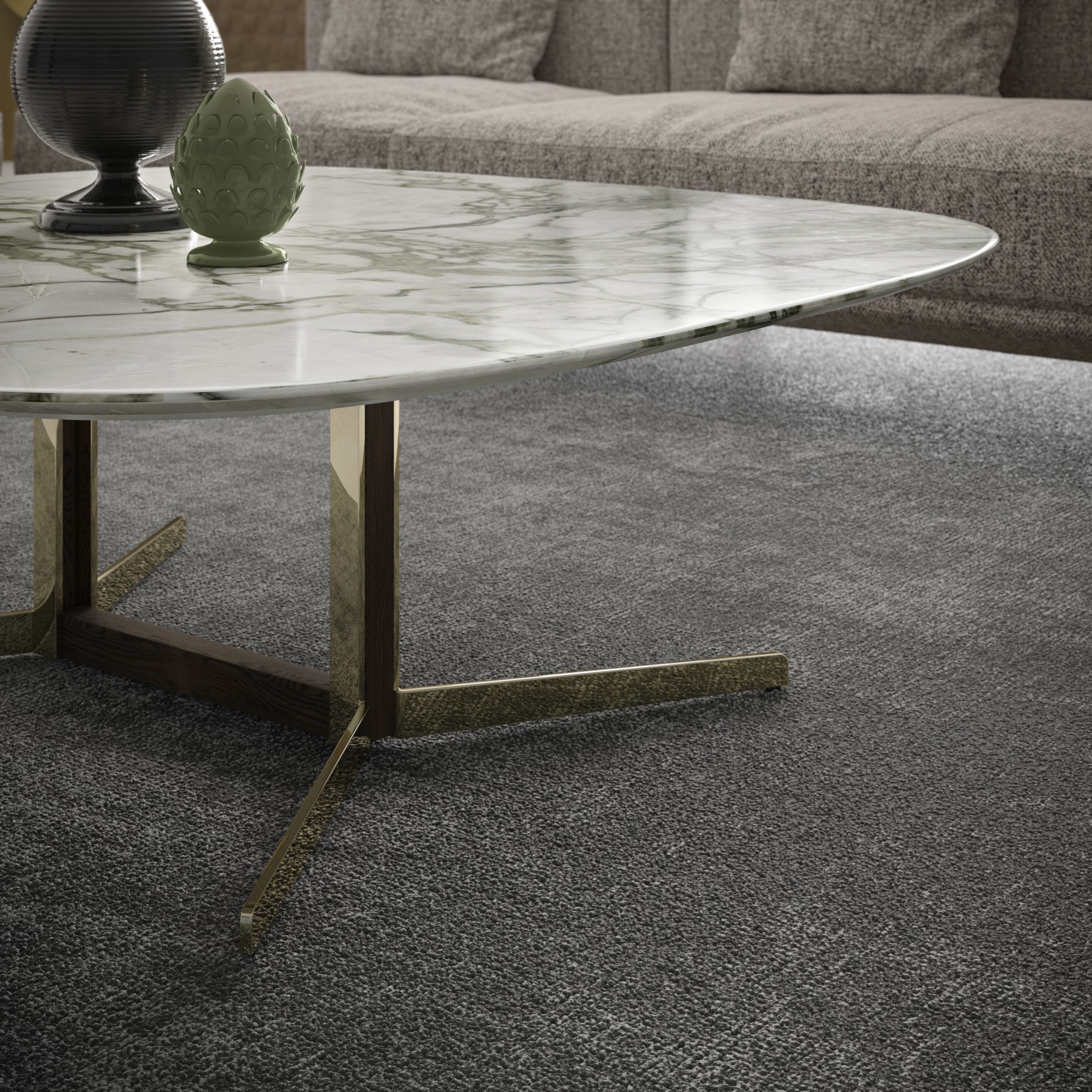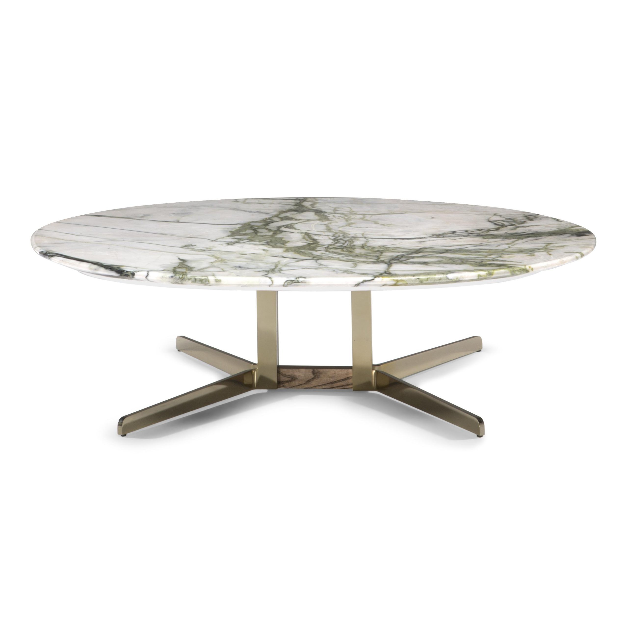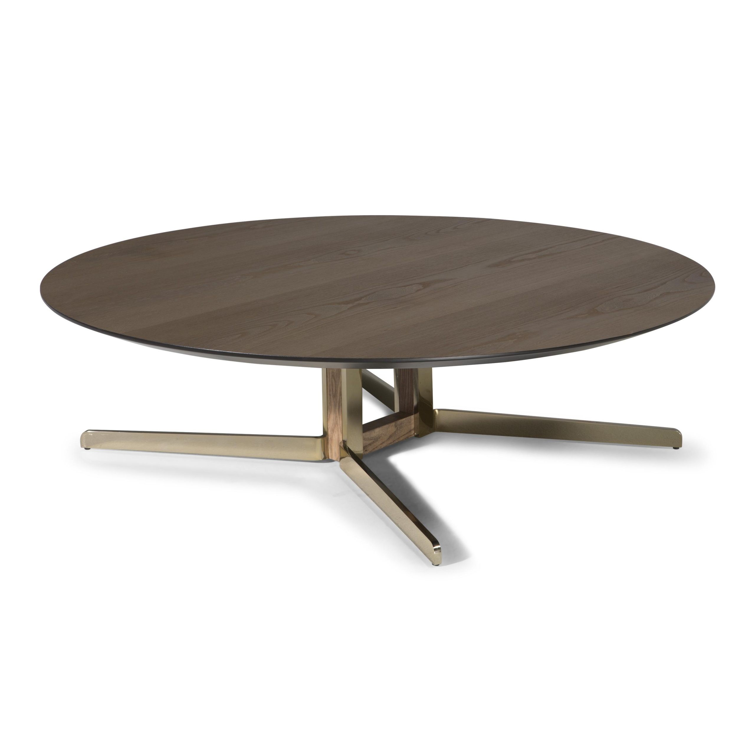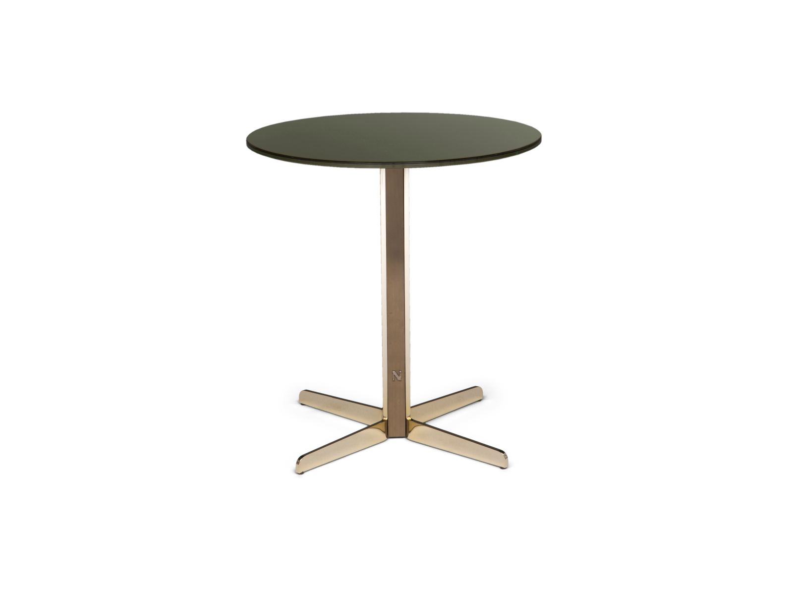 Podstavek in noge so izdelani iz lasersko rezanega, poliranega in ponikljanega pocinkanega jeklenega jekla s tekočim premazom v barvi šampanjca. Kovinsko podstavek je okrašen z vložki iz masivnega jesenovega lesa tobačno rjave barve.
