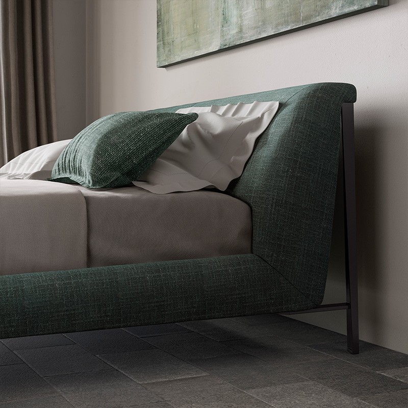 Visoke noge iz lakirane kovine dajejo dizajnu privlačno zračnost in olajšajo čiščenje tal. Obe strani postelje in hrbtni del vzglavja so v celoti oblazinjeni in tapecirani, kar omogoča elegantno in nežno postavitev postelje v kateri koli položaj v sobi.