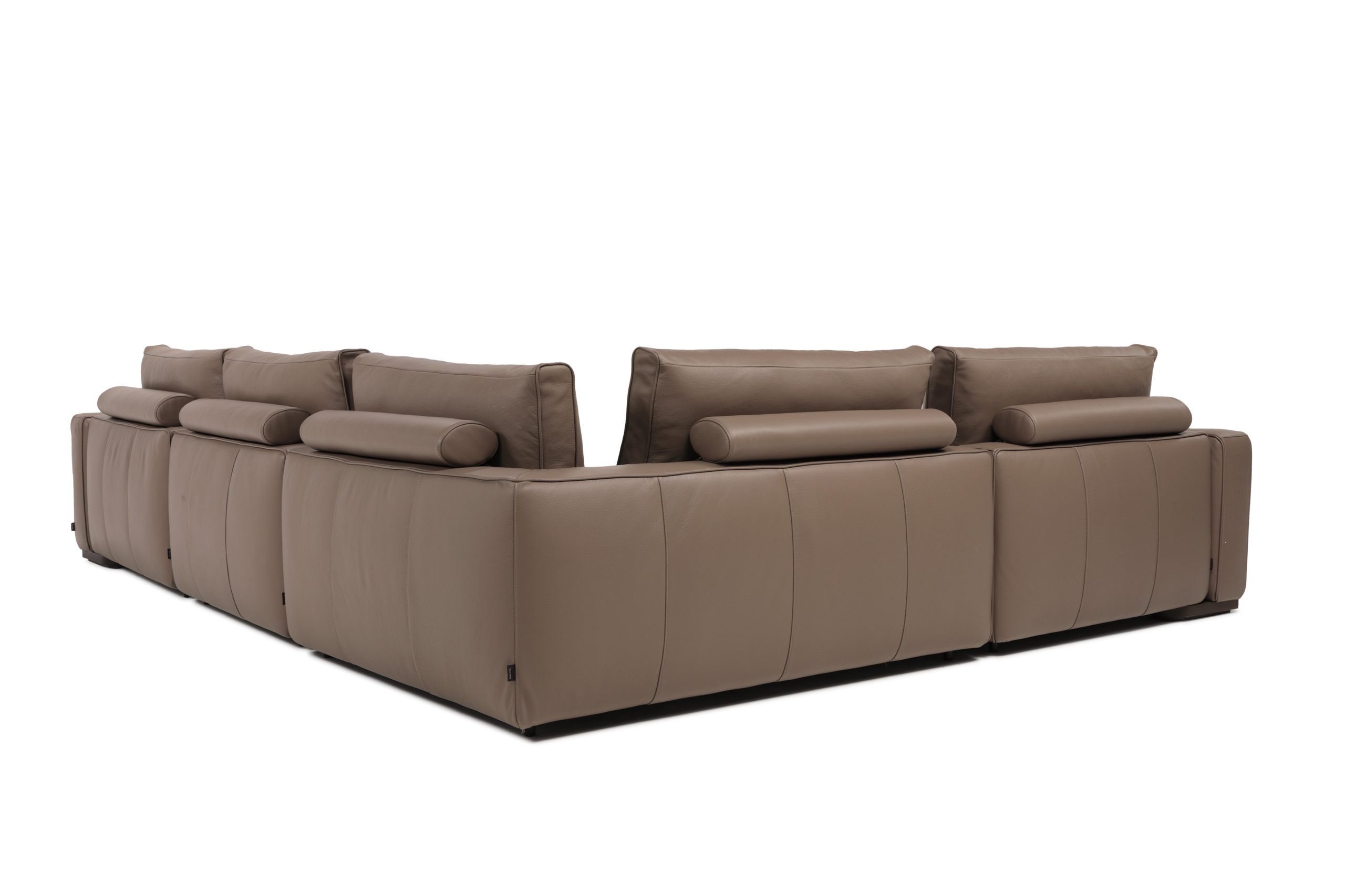 Nasloni za roke so na voljo v dveh različnih višinah in širinah ter obdajajo globoke sedeže in ustvarjajo edinstvene in vsestranske konfiguracije. Linije kavča so poudarjene z obrobo iz blaga, kovinske cevaste noge pa imajo šesterokotni del na hrbtni strani naslonjala.