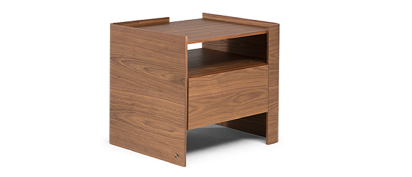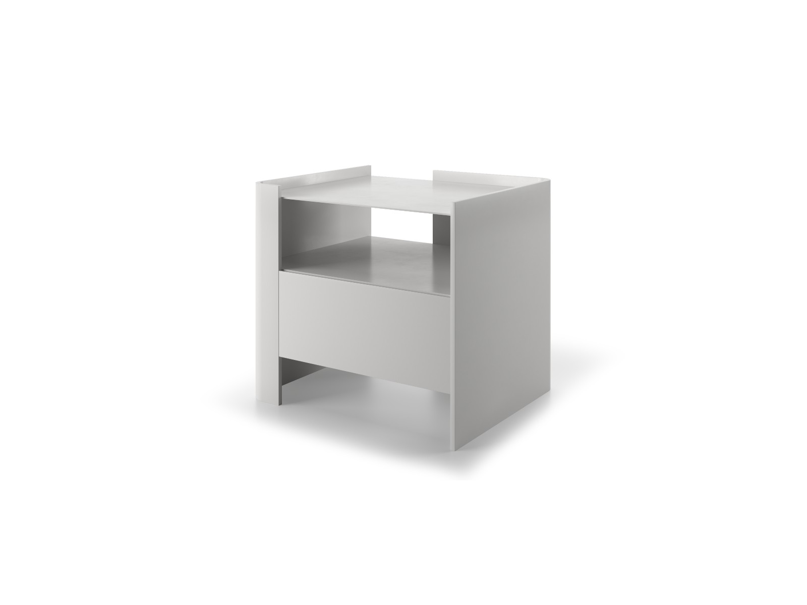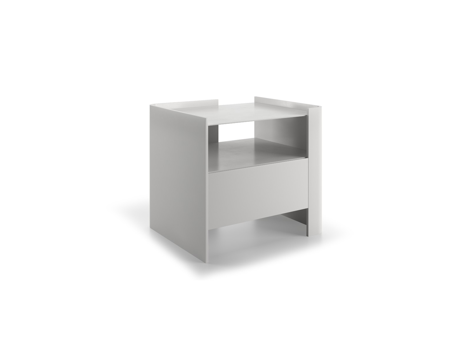 Nočna omarica je na voljo samo z lesenim zgornjim delom. Predali z mat lakirano notranjostjo v enaki barvi kot zunanjost. Komoda z mehanizmom za odpiranje na potisni pogon z oblazinjenim zapiralom Blum. Nedrseče ABS nogice proti prstnim odtisom so na voljo tako za komodo kot za nočne omarice.