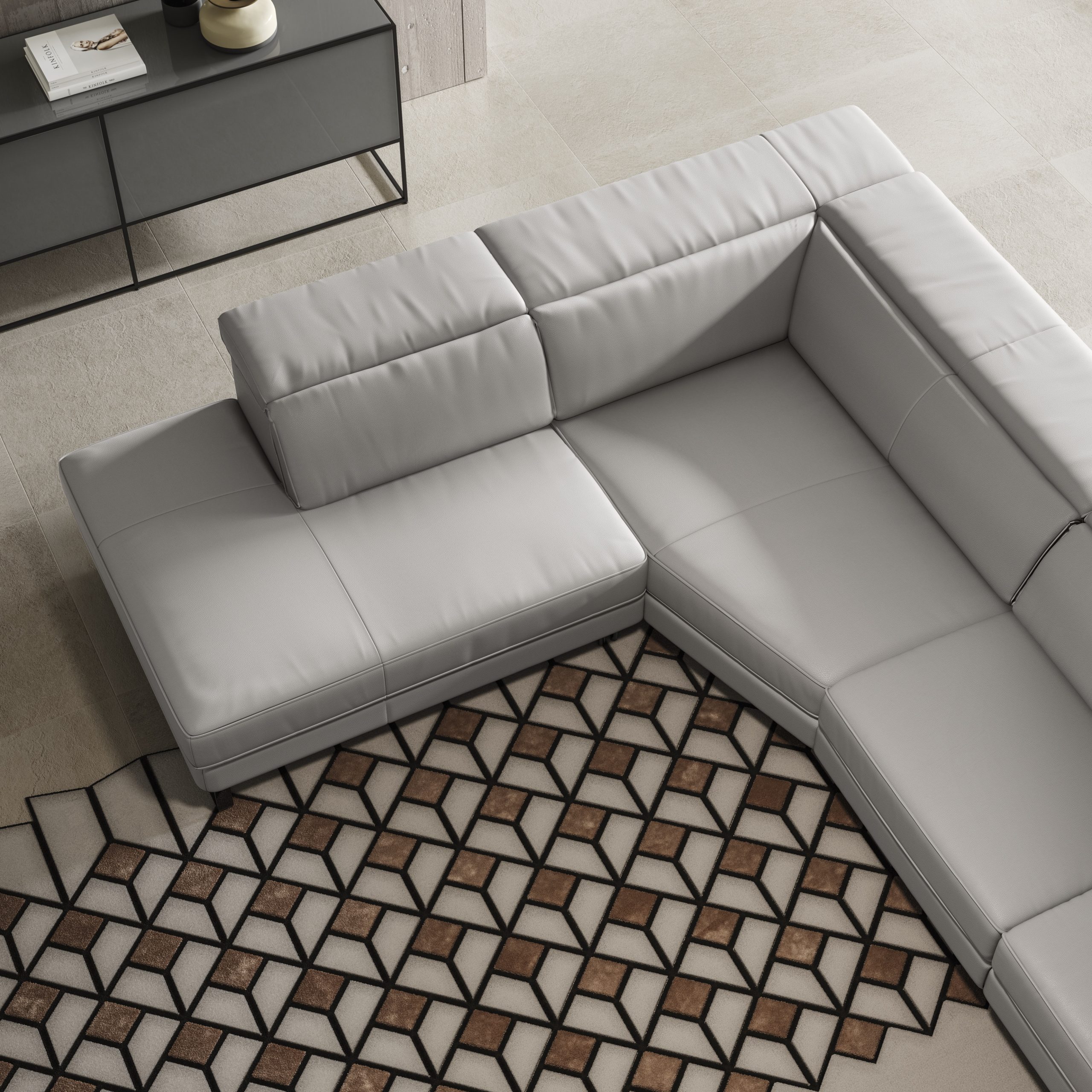 Inovativna sedežna garnitura, izboljšana z vrhunsko izdelavo – lepljeni šivi razkrivajo izvrstno obdelano usnje Natuzzi Italia. Ekskluzivni sistemi gibanja vam omogočajo, da vse prilagodite svojim potrebam z zložljivim naslonom za noge in vzglavnikom.