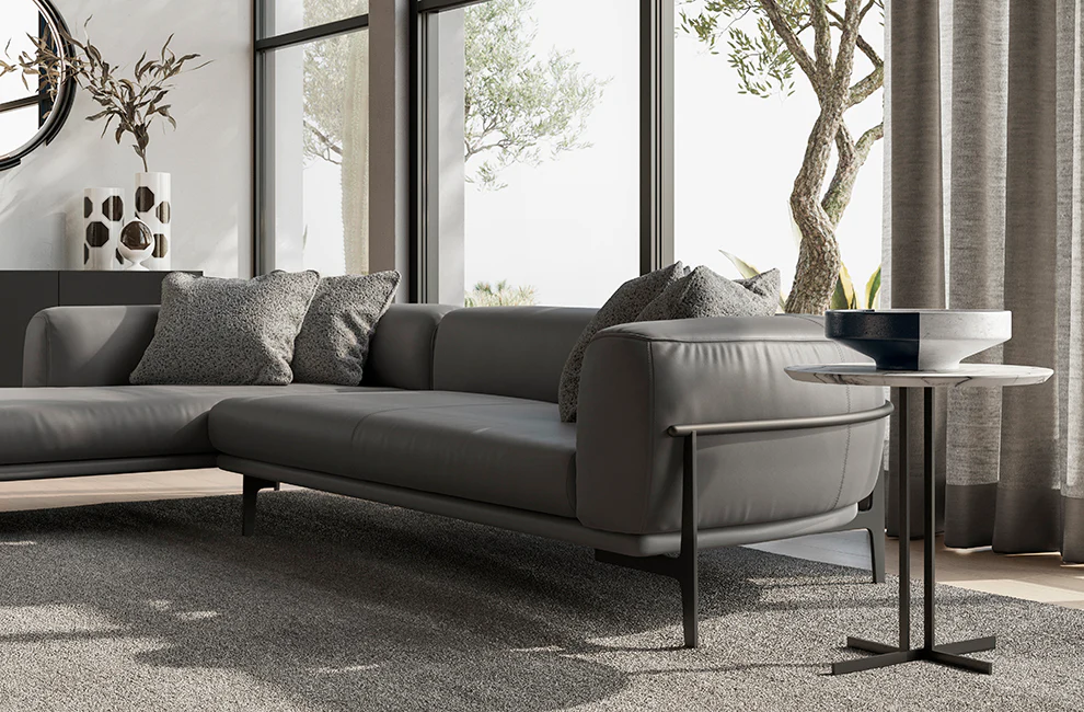 Sedežna garnitura Oblo vam nudi topel in velikodušni objem. Je kot varno okno, iz katerega opazujete kaj je onkraj stekla. Kovinska konstrukcija objema celotno oblazinjeno površino sedežne garniture in poudarja elegantno silhueto, kot pas okoli gibajočega se telesa.