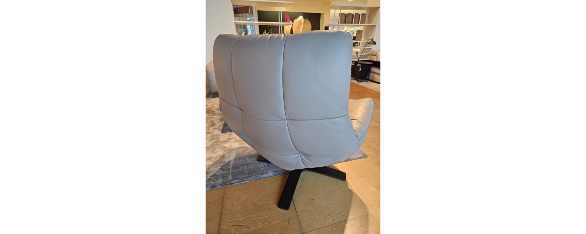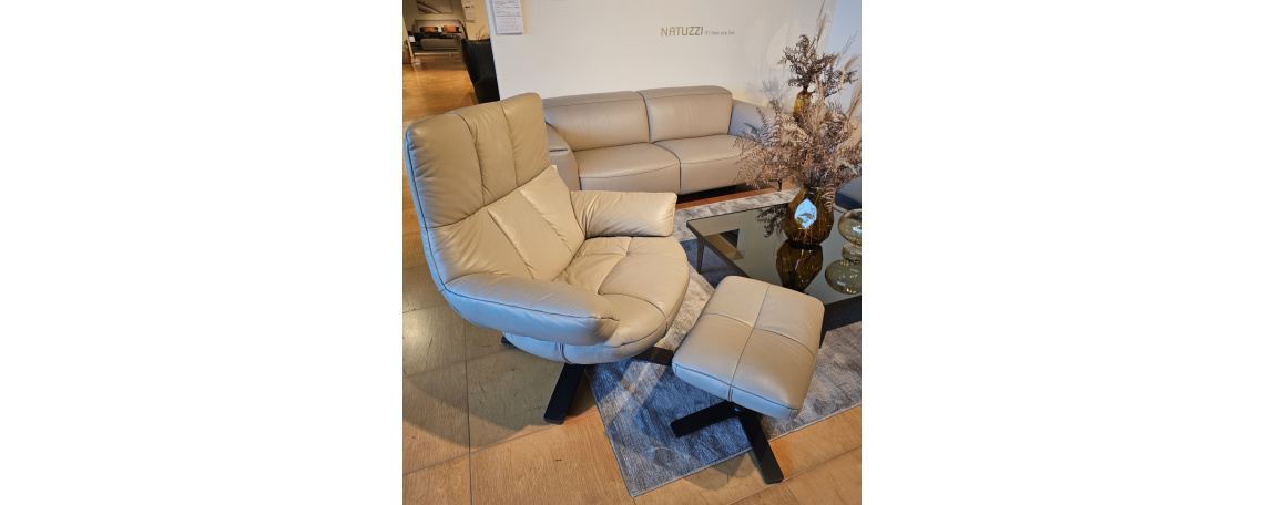 ODPRODAJA SE: fotelj model Re-Vive. Fotelj je oblazinjen v svetlo rjavo usnje.